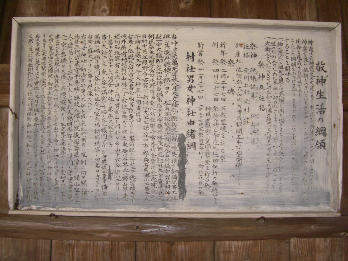 創建は不明ですが、約800年前(鎌倉時代)と推定され、正空上人(しょうくうしょうにん)が男女神社南東約1キロのところに光明寺を建立し、光明寺の座主(最高位の和尚)が代々男女神社の神座を勤めていた事が、古い文献に記されています。