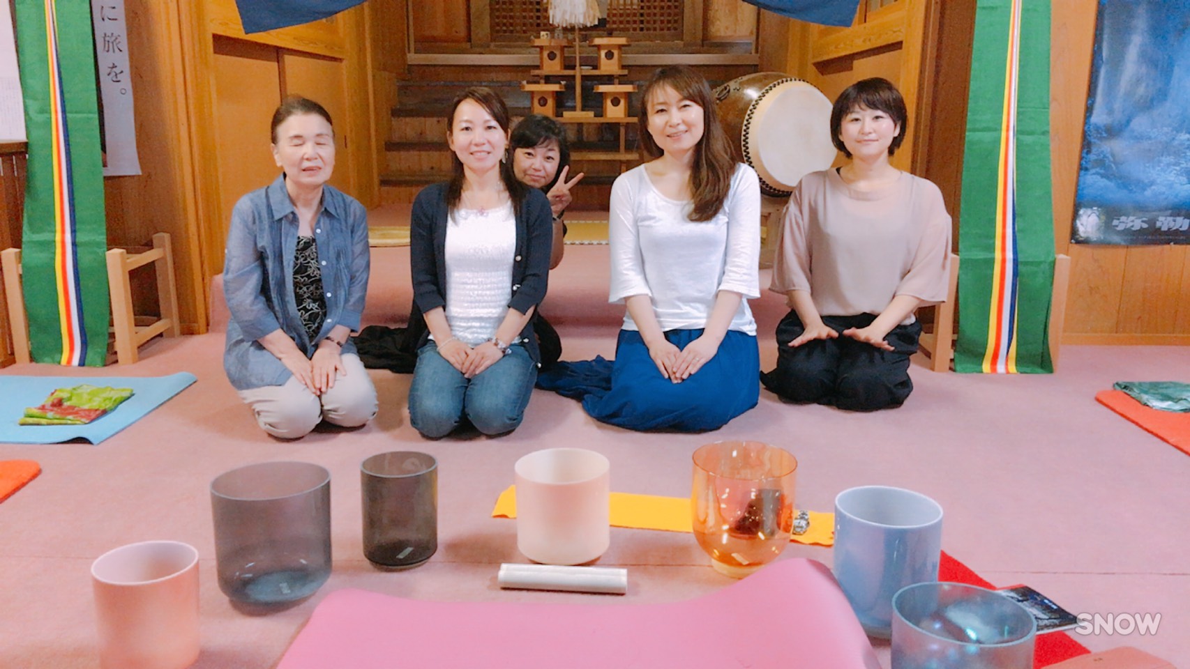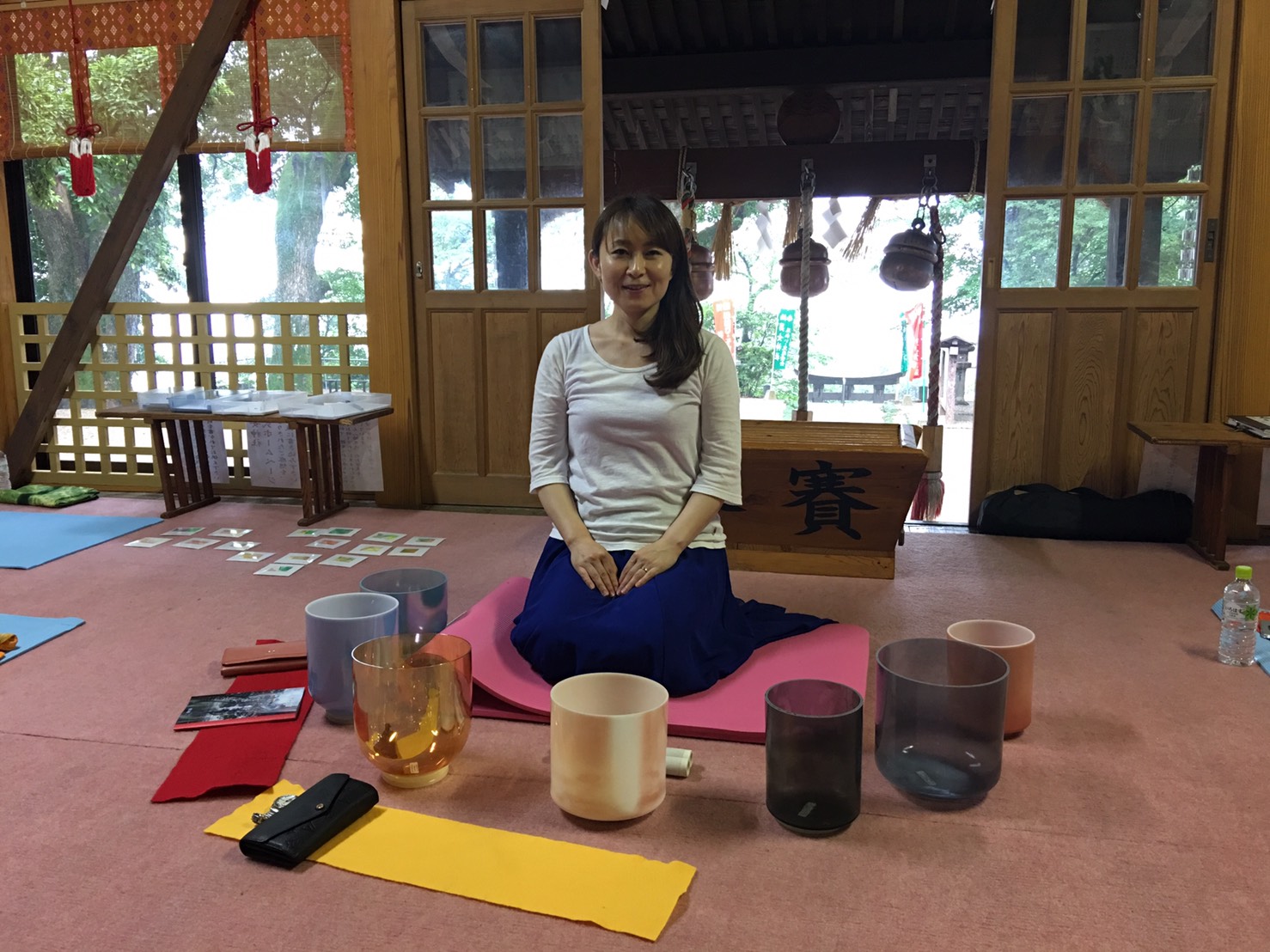- クリスタルボウルの瞑想会が神社の建物内で行われました。
