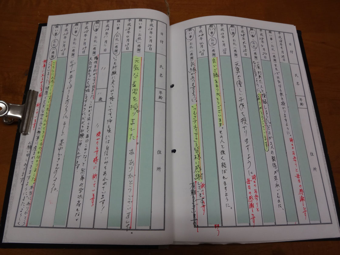 書かれたお礼や感謝の心を、朝のお勤めの時に、神様にお伝え致します。