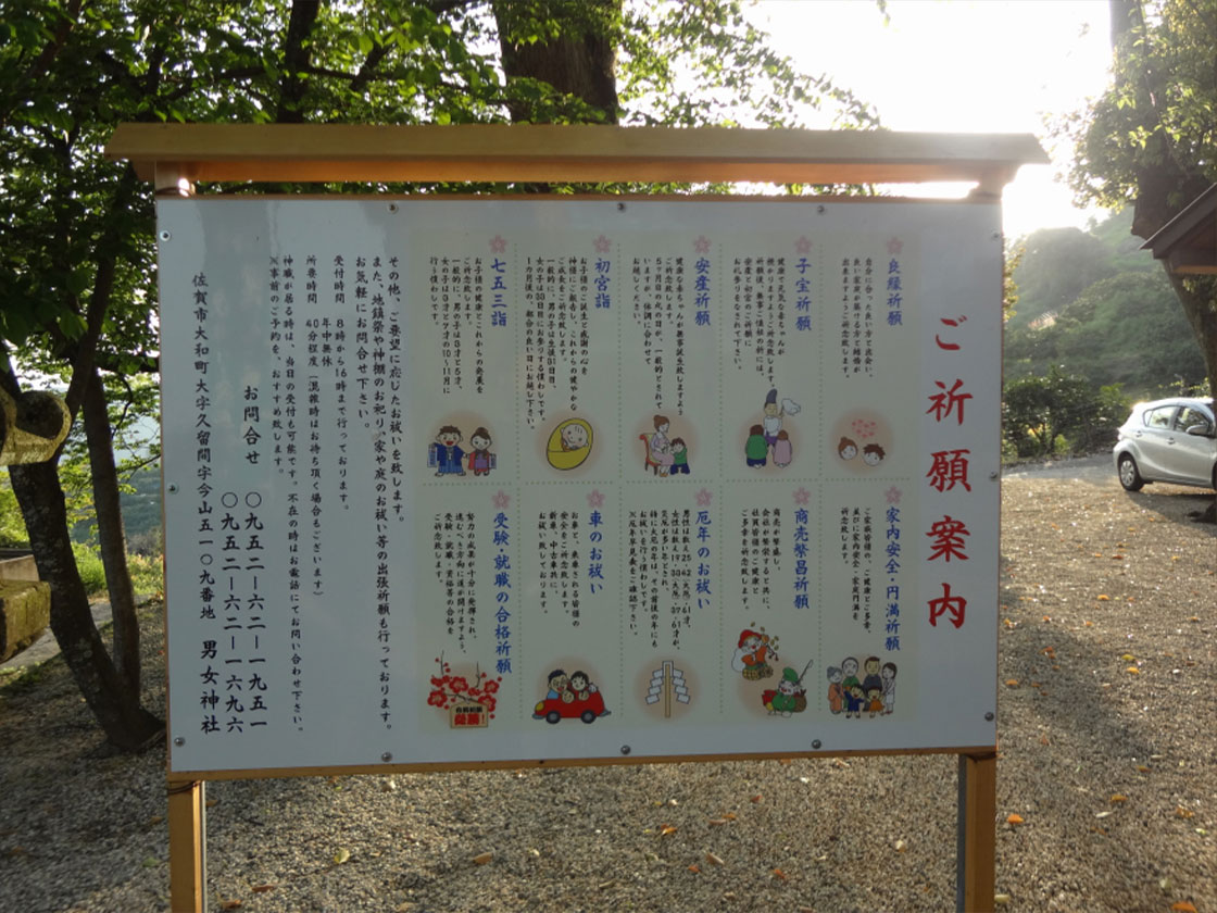子宝は夫婦の共同作業です。ご夫婦で、神様に感謝の心を捧げられてみられて下さい。また、子宝は家の繁栄につながる事ですので、ご家族でお参りされたら尚良いと思います。また、男女神社に子宝のお願いをした事を、お仏壇(ご先祖様)に報告させて頂くのも良いでしょう。
