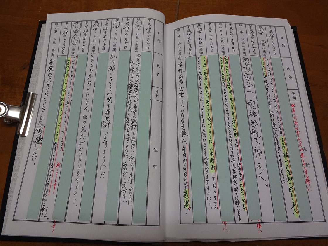 一冊が終わられたら、お供えしてお祓いを致しますので、遠慮なくメールやお電話下さい。また、感謝を書いて良かった事があれば、参拝名簿やホームページの掲示板にご記入下さい。